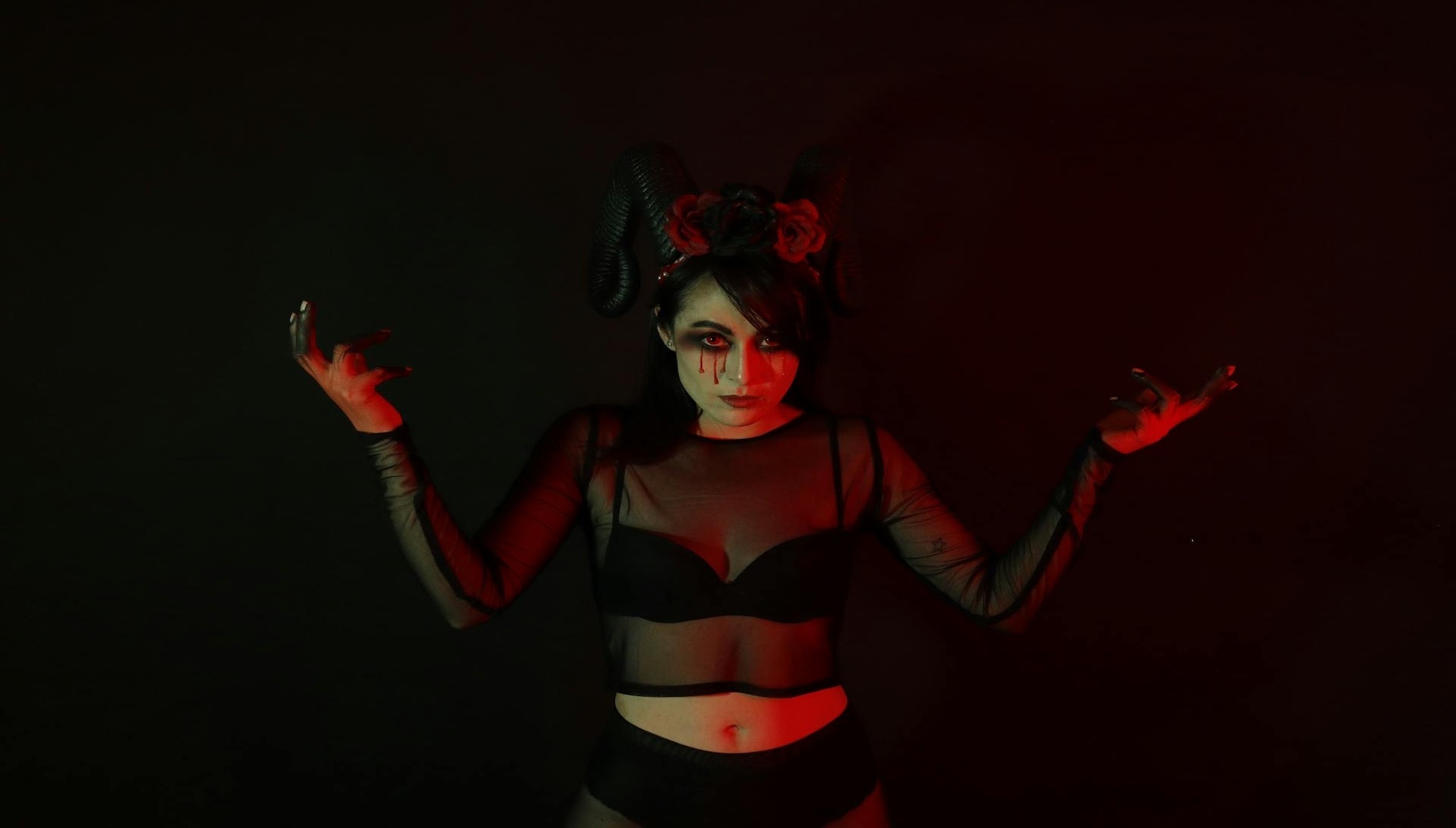 La queue du diable se dessine sous l’un des yeux, toujours avec le rouge à lèvres. Une ligne sinueuse qui se termine en pointe évoque parfaitement cet attribut diabolique.