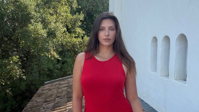 Na pláži bývalá americká gymnastka Livvy Dunneová v červenobílém oblečení s úsměvem na tváři naznačila restart seriálu „Pobřežní...