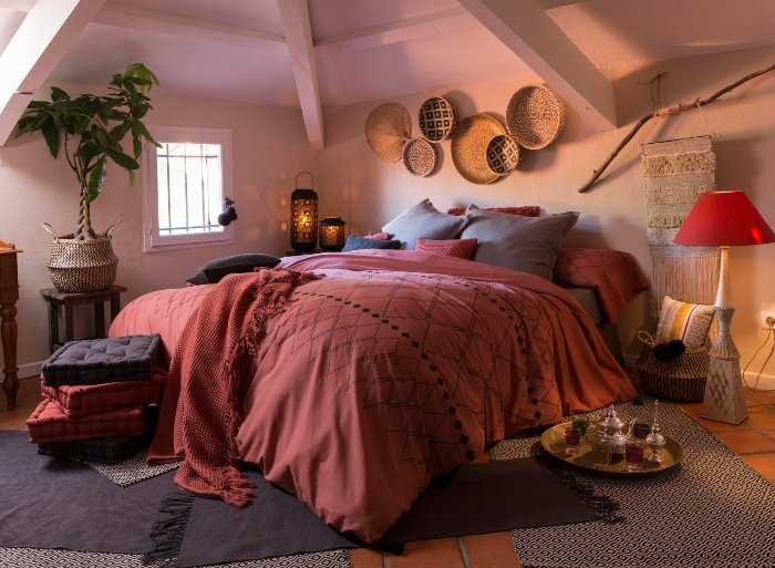 Cette deuxième chambre se caractérise par une hauteur sous plafond impressionnante et de très belles poutres. L’ensemble est sublimé par des tomettes authentiques. Le but a tout de suite été de transformer ce volume déstructuré en atout. L’inspiration orientale s’est imposée naturellement.