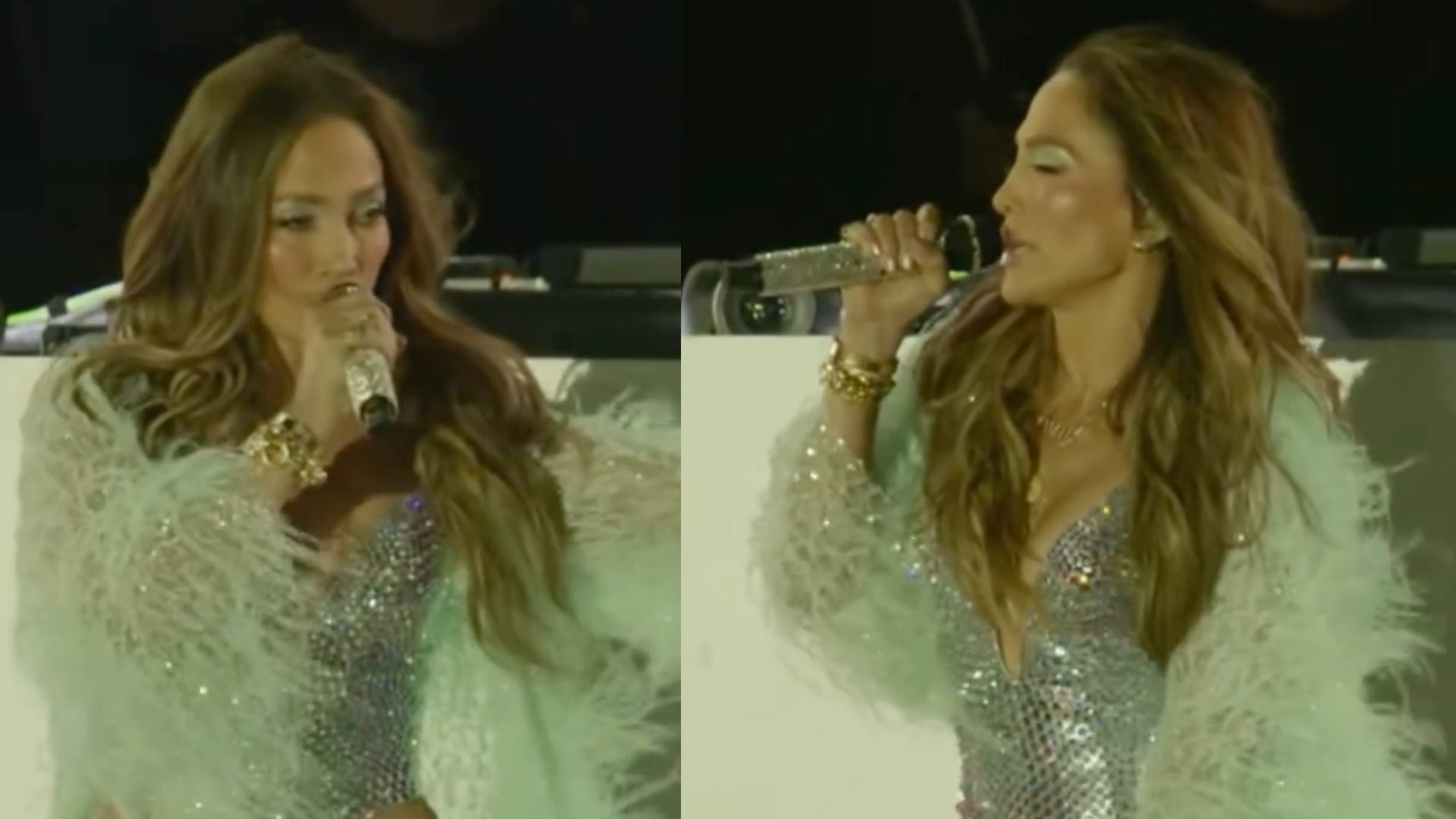 Jennifer Lopez est régulièrement associée à des silhouettes pensées pour la scène, où les matières brillantes et les coupes structurées jouent un rôle central. Les looks portés lors de sa résidence à Las Vegas comportaient déjà des éléments similaires, notamment des costumes ornés de cristaux et des silhouettes ajustées. Ce type de tenue permet d’accentuer la présence scénique tout en s’adaptant aux exigences des performances musicales chorégraphiées.