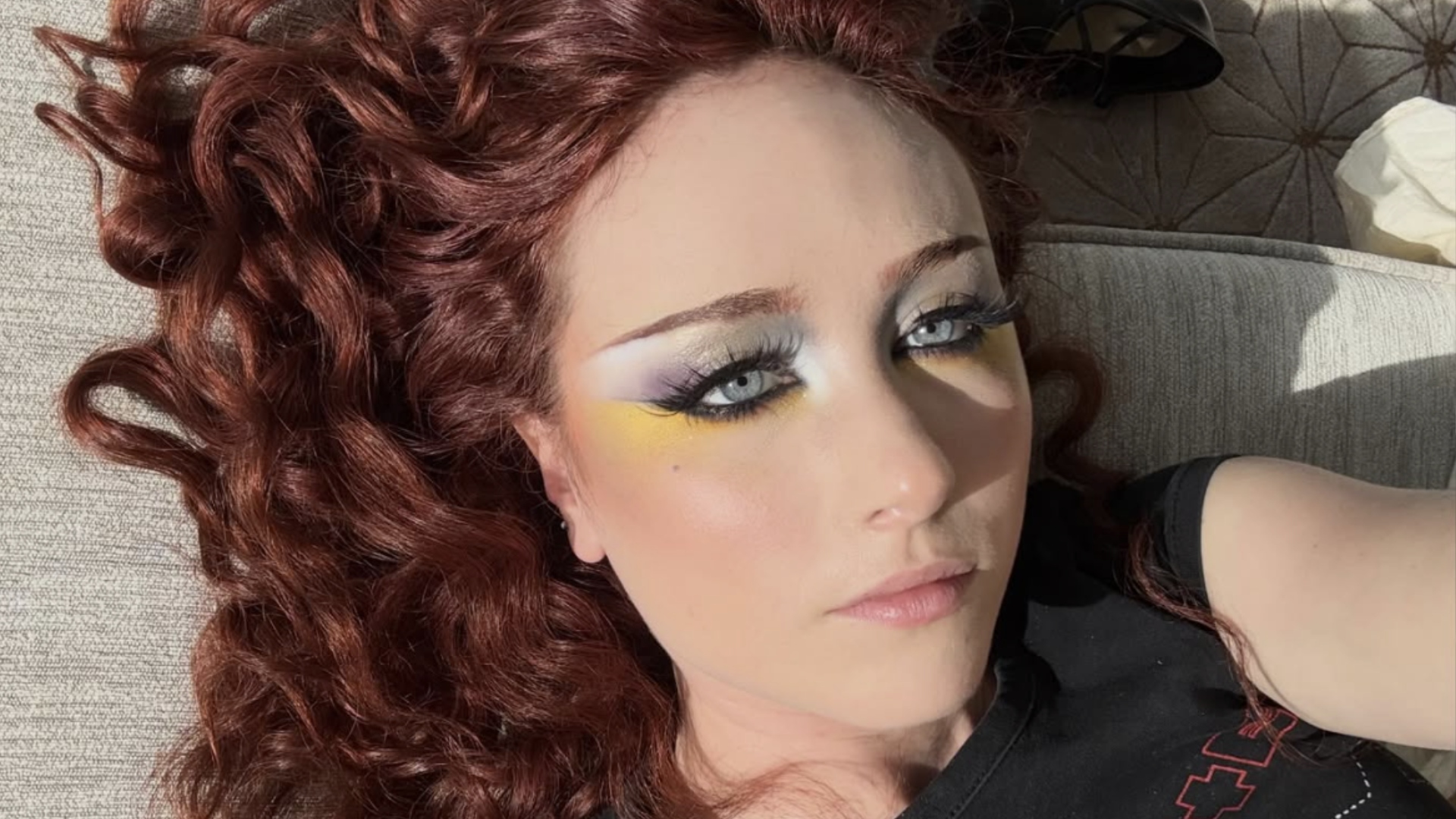 La chanteuse portait une robe bleu nuit en dentelle dégradée, du col roulé corseté opaque à la jupe mi-mollet asymétrique. Bas résille, gants noirs en dentelle et escarpins à motifs complétaient cette silhouette ombrée sophistiquée. Son carré rouge feu aux angles nets, chin-length, renforçait cette vibe poupée gothique.