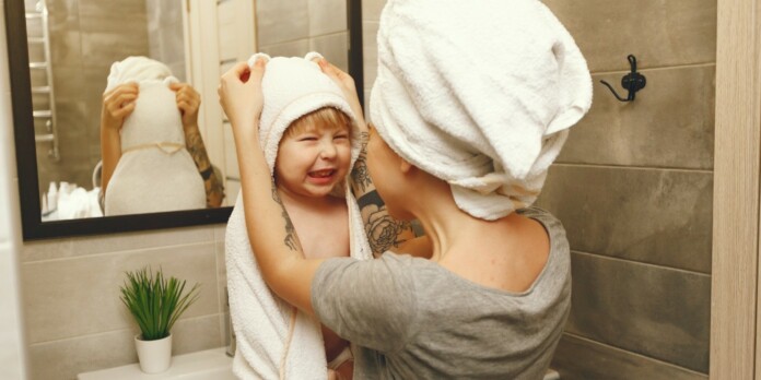 Après avoir barboté pendant de longues minutes et envoyé valsé de l'eau jusqu'au plafond, il est temps que l'enfant quitte son milieu aqueux. L'opération...