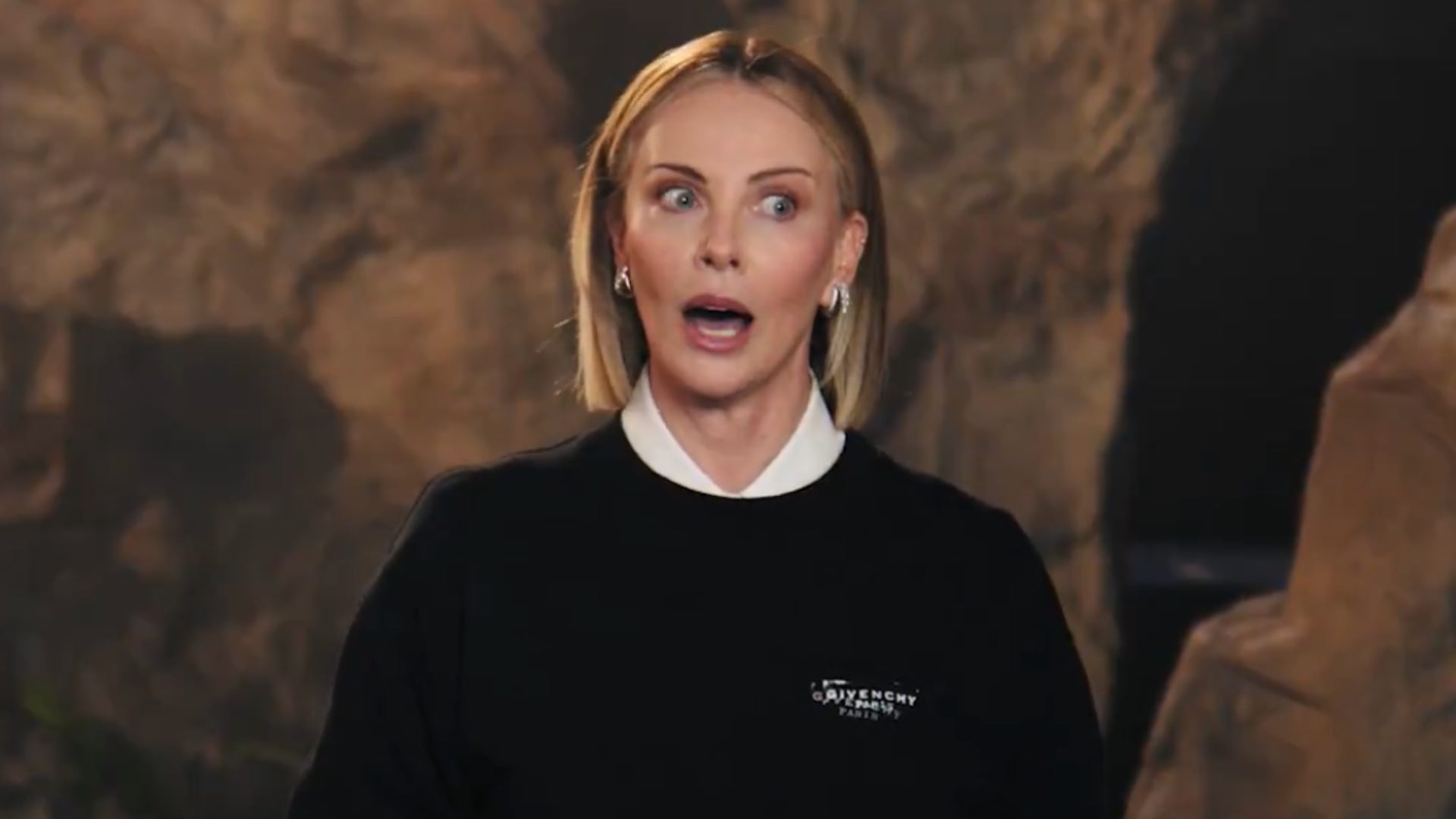 Assim que enfiou as mãos na caixa, Charlize Theron sentiu algo se mexer. Recuou abruptamente, repetindo que "estava vivo", e então deu um passo à frente para olhar — e descobriu uma píton-verde-arborícola. Sua reação foi imediata e sem filtros: "Puta merda, meu coração!", exclamou, antes de perguntar com a maior seriedade se apertar levemente o réptil poderia tê-lo provocado e se era provável que ele a mordesse.
